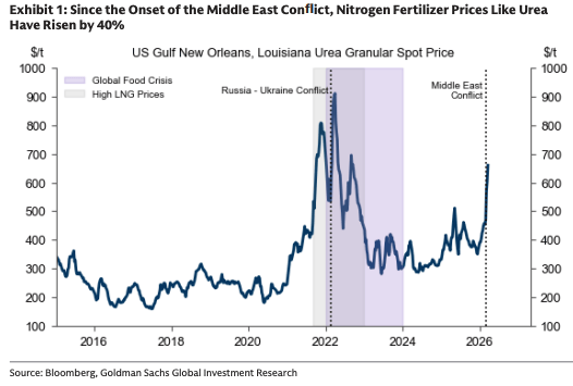 Goldman Sachs explains how the disruptions to the Strait of Hormuz impacts the global nitrogen fertilizer market (which accounts for 60% of global fertilizer use), and why the Middle East conflict underscores the role of commodities as a hedge against supply disruptions.