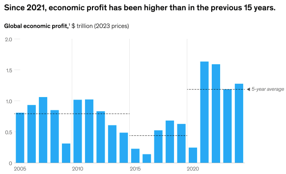 McKinsey & Company reports that global corporate economic profit reached an all-time high of $4.3 trillion in 2024, rebounding sharply from pandemic-era lows. They find that just 20% of companies captured 90% of total economic profit, underscoring widening performance inequality and the growing strategic importance of scale, capital efficiency, and innovation-led growth.